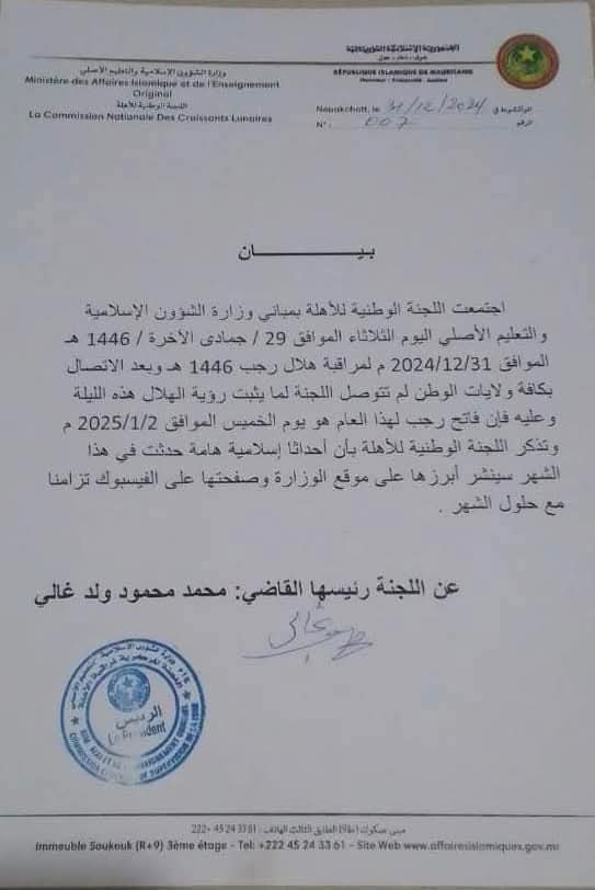 المعدن : أعلنت لجنة الأهلة أنها خلال اجتماعها الليلة البارحة الموافق 29 جمادى الآخرة، لم تتوصل بما يثبت رؤية هلال شهر رجب، وعليه فإن يوم الأربعاء الموافق للأول من شهر يناير هو المكمل لشهر جمادى الآخرة 1446، والخميس 02 يناير هو الأول من شهر رجب الفرد.